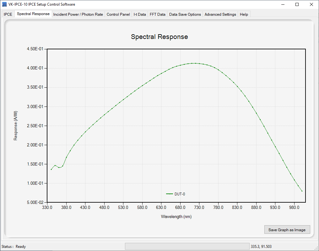 “IPCE” tab of the control software allows user to set scan range, Irradiation mode, and plot options. Also user can open previously saved baseline calibration curve or start new calibration curve. Si photo diode was used as a sample for reference.